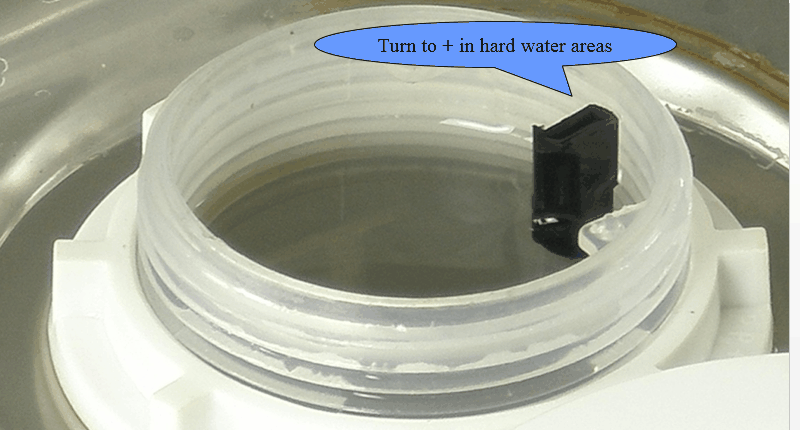 Turn the black pointer towards the '+' setting to make the water softener more effective. If you are using 'all in 1' tablets then it may be a good idea to use salt which will enhance your detergent tablet and improve the cleaning results from your dishwasher. If you are not sure if your water is hard, contact your local utility company for advice.